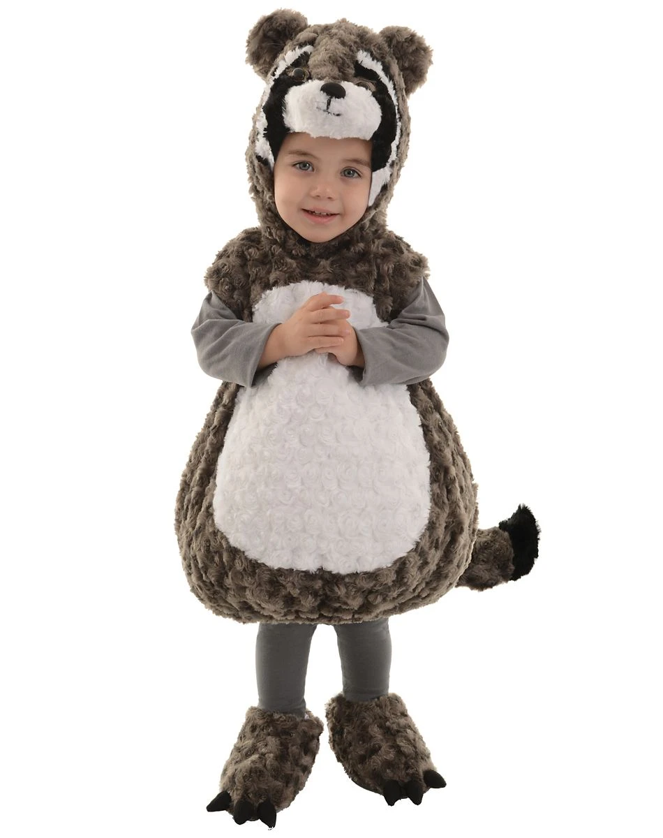 Turn your little one into a cute and cuddly critter with this toddler raccoon belly costume. This raccoon costume includes a soft plush body, shoe covers, and a hood to complete the raccoon look. Velcro closure will be sure to keep your child’s outfit secure and comfortable throughout the night. These sneaky critters are quite a handful, so keep an eye on your little one to make sure they don’t go picking through someone’s garbage!