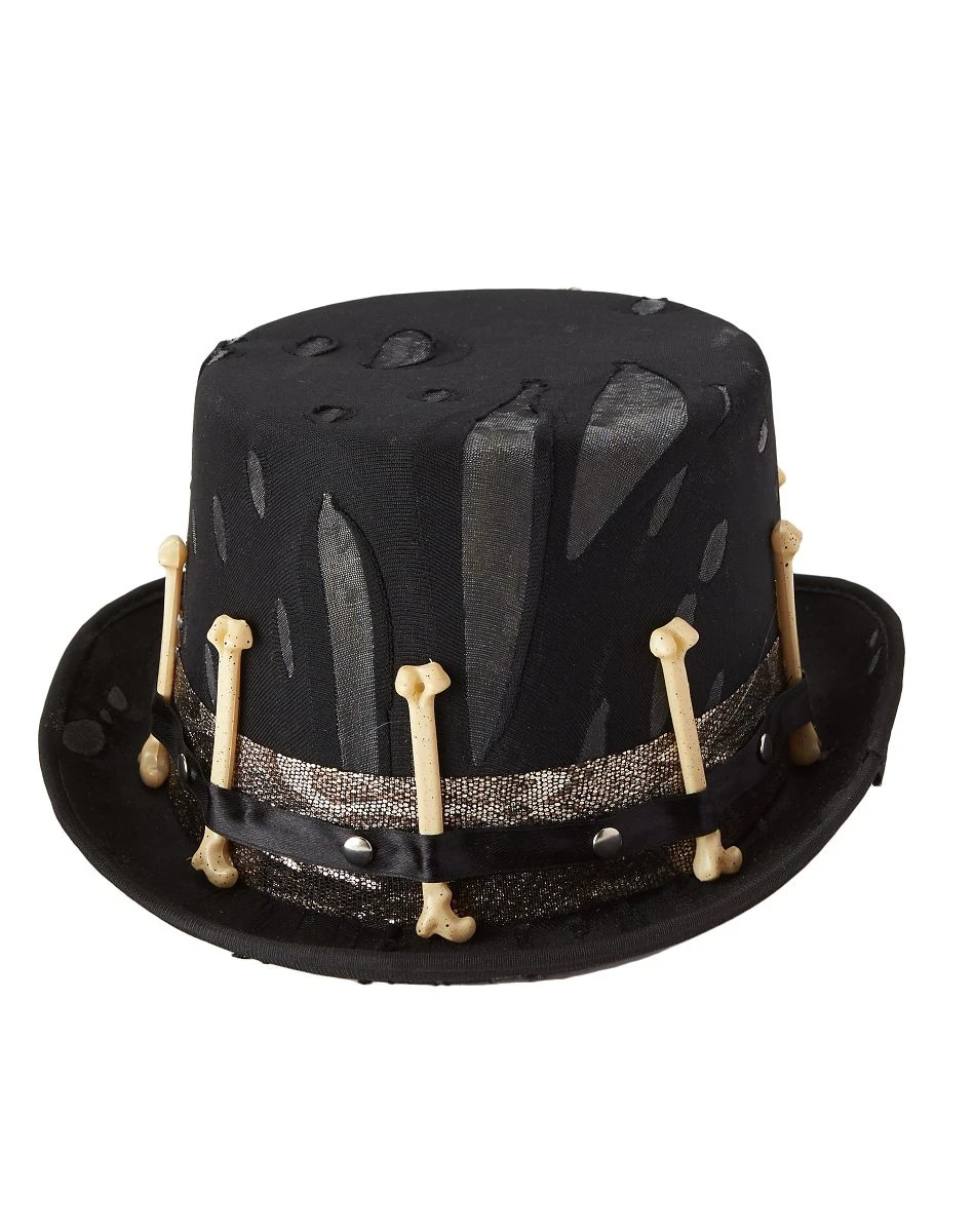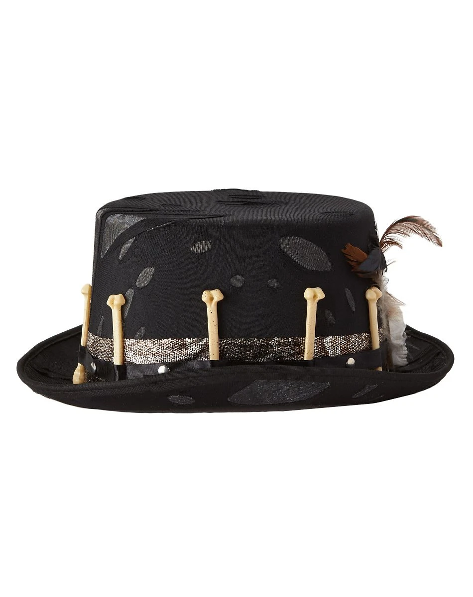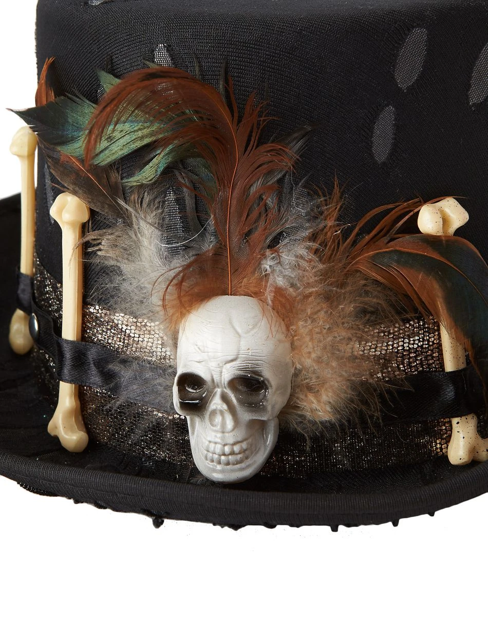 Complete your Halloween look with this witch doctor top hat. Black hat features a distressed detail for a worn and tattered look. Ribbon trim just around the brim gives you a little extra sparkle, and will have you shining all night long. Skull and bone detail will knock your friends dead! Feather accents for the perfect finishing touch.